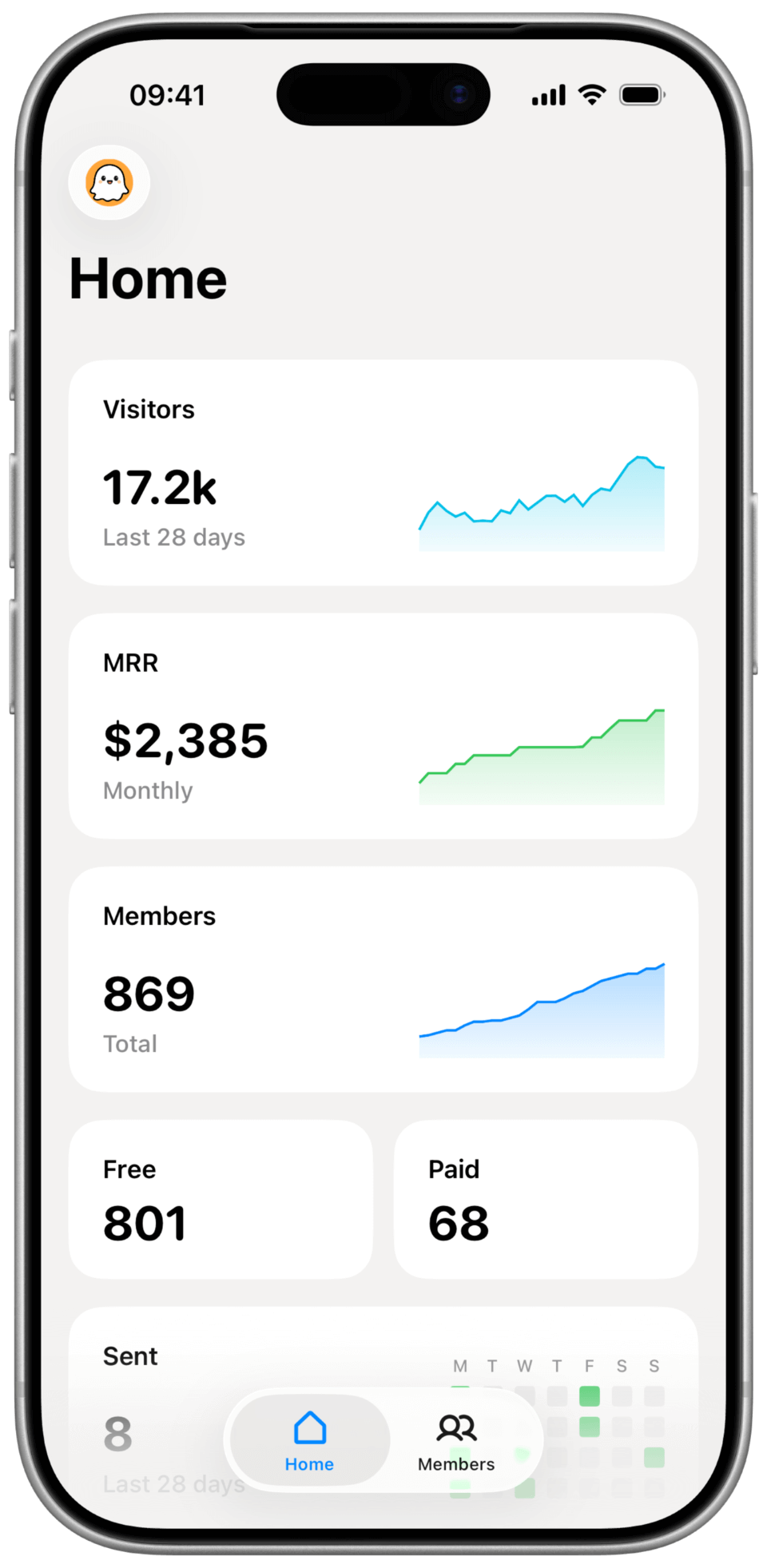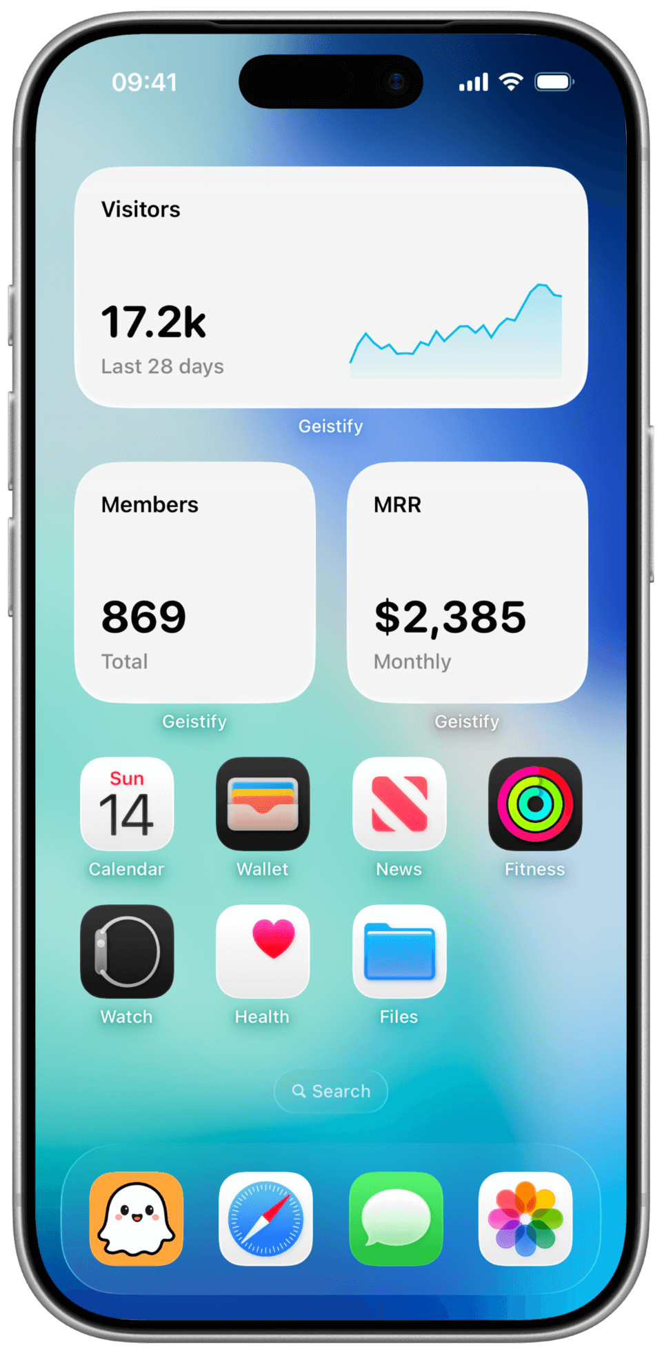 iOS widgets put your key Ghost metrics right where you already are. Check your progress in a glance, no app opening required.